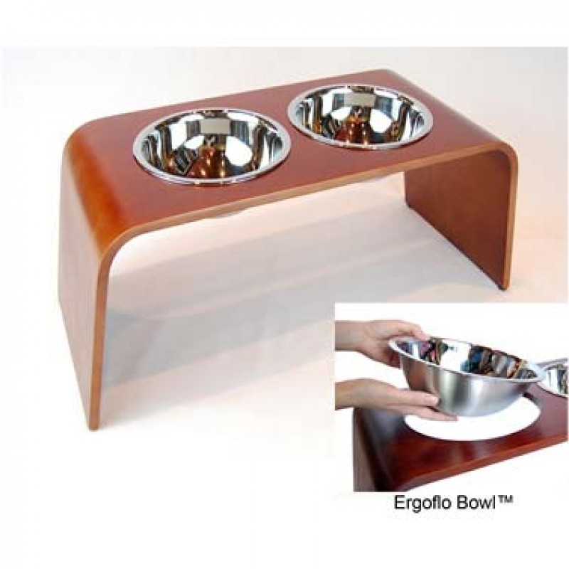 The elegant wood base with beautiful brushed finish Ergoflo Bowls compliments any home. Ergoflo round bottom bowls have no corners to collect food allowing for easier eating and cleaning. The wood base is also made for easy clean up utilizing a durable triple layer finish making it water resistant. Includes (2) Ergoflo Bowls.
