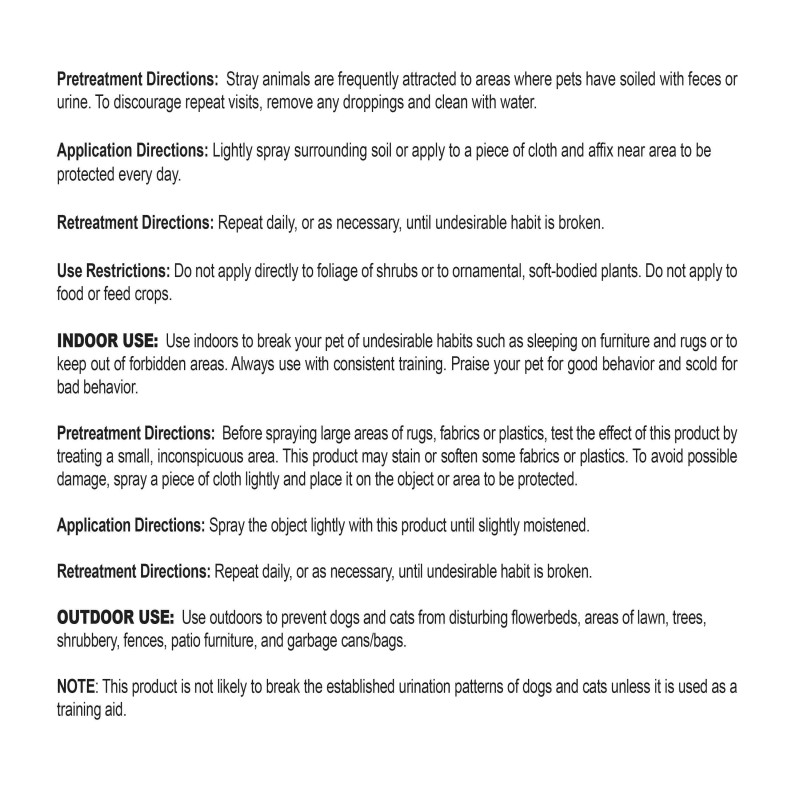 Keep-Off products provide pet parents with an easy, efficient way to train pets to stay out of designated areas. Repels for up to 24 hours when applied daily.