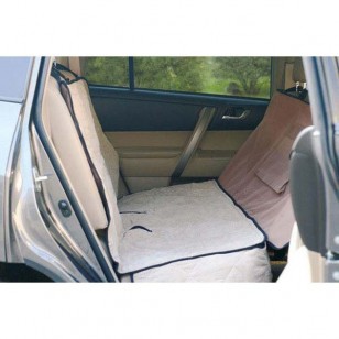 This combines a semi-fitted seat cover with removable flap, flap is designed to keep pet in the backseat. The back of the seat and the sitting area is quilted MicroSuede, backed with 600 denier nylon with a vinyl coating to keep seats clean. The waterproof backing keeps dirt and spills off the seat. There is a storage pocket for keeping leashes and toys. Available in one size, two colors.
