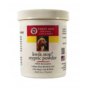 This styptic powder quickly helps stop bleeding from minor cuts and nail clippings. Kwik Stop has been the leading styptic powder for over 40 years, and this powder contains Benzocaine to block pain and stop bleeding. Ingredients: Ferric Subsulfate, Aluminum Chloride, Diatomite, Bentonite, Copper Sulfate, Ammonium Chloride, Benzocaine. Directions: Apply with moistened cotton applicator to the cut, nail or other superficial bleeding area using moderate pressure for five to ten seconds. Do not use on deep wounds or body cavities.