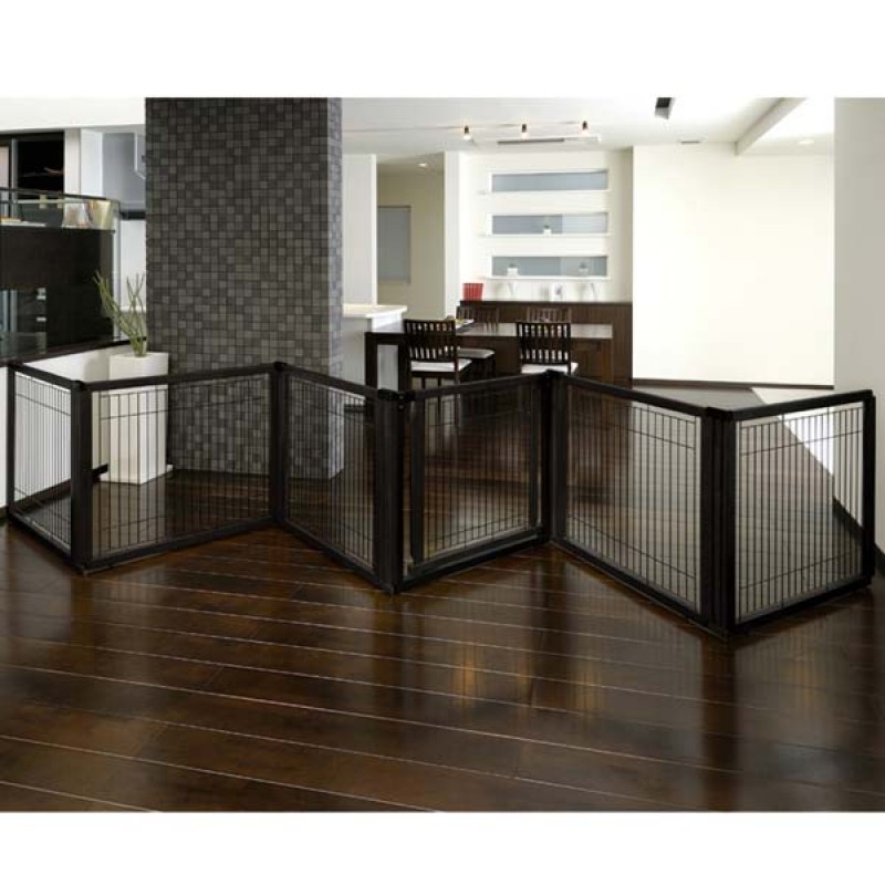 The luxury of three pet products in one! It’s specifically designed to confine your pet safely in areas with larger openings, yet fit beautifully in any home décor! The gate includes a lockable door that allows you to move freely from room to room without having to shuffle the entire unit. Each panel locks in place at 90⁰ and 180⁰ angles using a specially designed cap, which also provides extra stability. In addition, optional panels allow you to configure the gate, divider and pen any way you want and as large as you want! The gate's beautiful hardwood construction complements Richell's other fine wood pet products. The Option Panel and Wire Top are sold separately. The gate is available as a 4-Panel see our Convertible Elite Pet Gate 4-Panel.