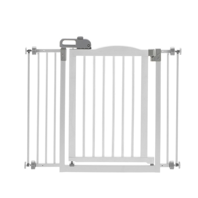 The tension-mount design allows the gate to stay firmly in place with rubber stoppers without damaging wall surfaces. Gate door opens in both directions for ease of movement from room to room. The latched gate handle locks/unlocks easily with one hand. Now your pet can be safe and comfortable in any space with a doorway 32.1-36” wide. Designed for dogs 8.8 - 44 lbs. Extension to add 4” of width sold separately.