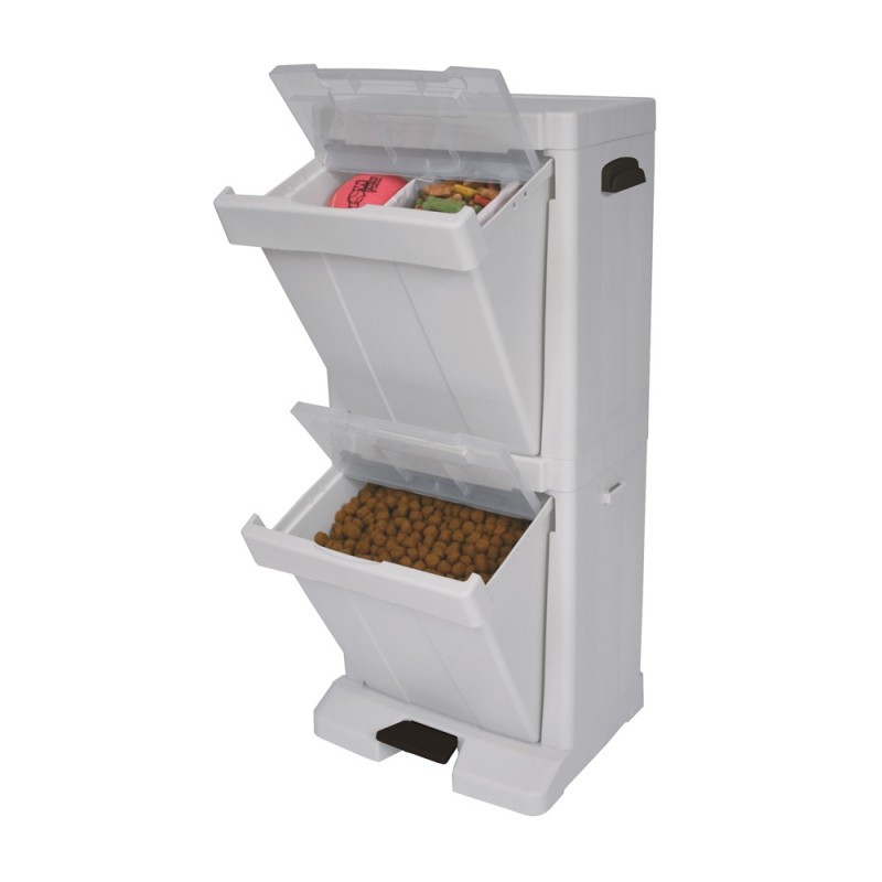 The tower contains two storage bins with snap-lock lids to keep freshness in and pests out. The bottom bin has a foot pedal for convenient hands-free access to pet food plus side hooks to hold leashes and bags. A 1.5 cup food scoop is included. Assembly required.